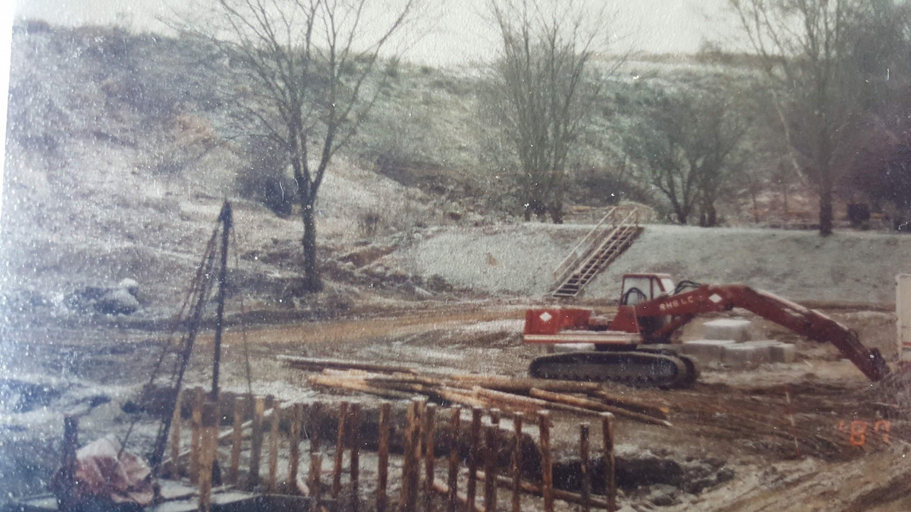 Specielt kan jeg huske en episode, hvor en gravemaskine, vi havde lånt af Fladbjerg Grusværk, sank ned i mudderet og blev ved at synke. Vi ringede til Per i grusgraven, som kom med en gummiged, men gravemaskinen sad uhjælpeligt fast. Til sidst måtte vi ringe efter en mobilkran. Hele natten gik med at få gravemaskinen løs, og hold da op hvor var vi trætte, inden vi sent om natten kom hjem.