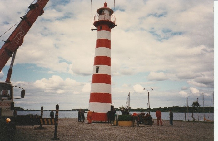 Jeg var ikke selv til stede på havnen, da fyrtårnet ankom, men det må have været noget af en transport. Helt lille er det jo ikke. Tårnet blev lagt på området vest for parkeringspladsen, og som det så ud!!! Der var ikke meget maling på det, og det var temmelig rustent, alle ruder var for længst knust og det lignede det, som det var hentet på. En skrotplads! Jeg tænkte, at dette ville blive en livslang udgift for bådelauget, og prøvede at ignorere, at det lå der og lignede noget katten havde slæbt ind.